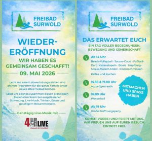 - Das neue KinderbeckenDas neue Kinderbecken im Freibad Surwold – Ein Ort für Spaß und Abenteuer! Wir freuen uns, euch heute von einem aufregenden Projekt zu berichten, das bald im Freibad Surwold Realität wird: unser neues Kinderbecken! Der Entwurf liegt vor und wir sind begeistert von den Möglichkeiten, die es bieten wird. Das neue Kinderbecken wird speziell für… Das neue Kinderbecken weiterlesen