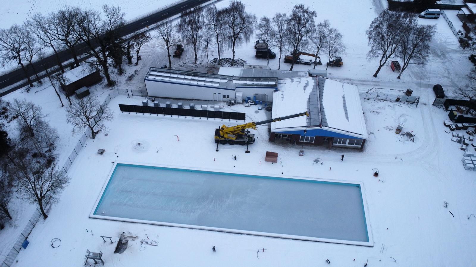 Trotz frostiger Temperaturen der letzten Wochen und einer dicken Schneedecke gehen die Arbeiten am Freibad unermüdlich weiter. Während draußen Eis und Schnee das Gelände in eine Winterlandschaft verwandeln, wird auf der Baustelle tatkräftig angepackt.
